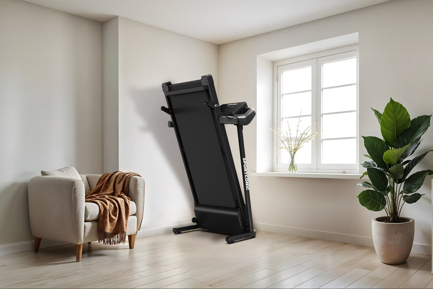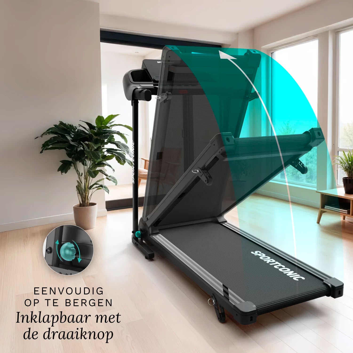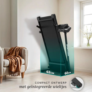 Nakon upotrebe, traka za trčanje može se bez napora spremiti u nekoliko sekundi. Lako se sklapa, a integrirani transportni kotači omogućuju jednostavno i bez napora pomicanje.